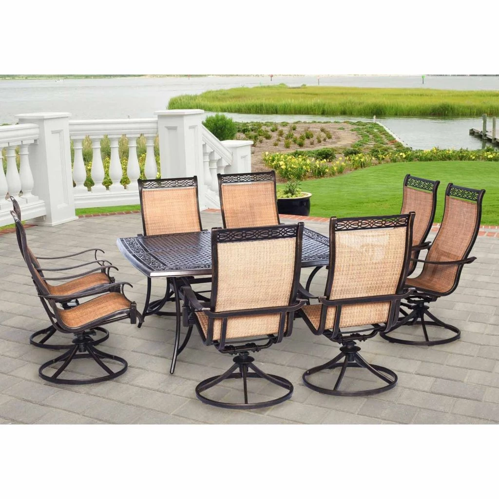 - High-quality dining set includes one large dining table and eight sling-back swivel rockers for the ultimate comfort throughout the meal
