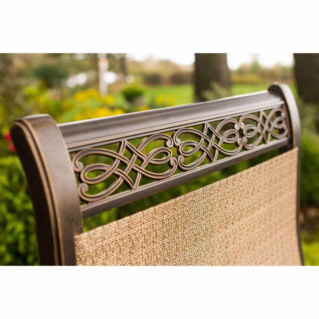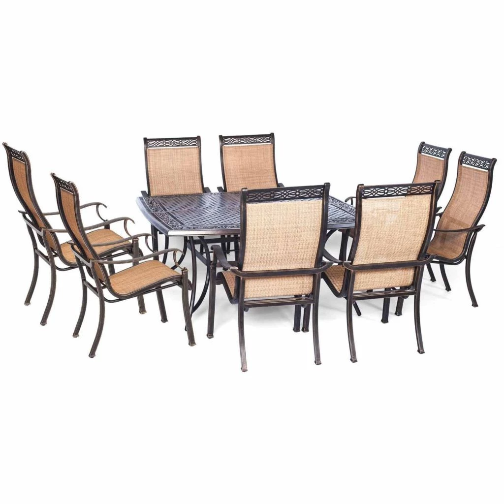 - Durable aluminum frames of this large dining set are polished with a protective bronze coating that accentuates any surrounding environment and repels weather
