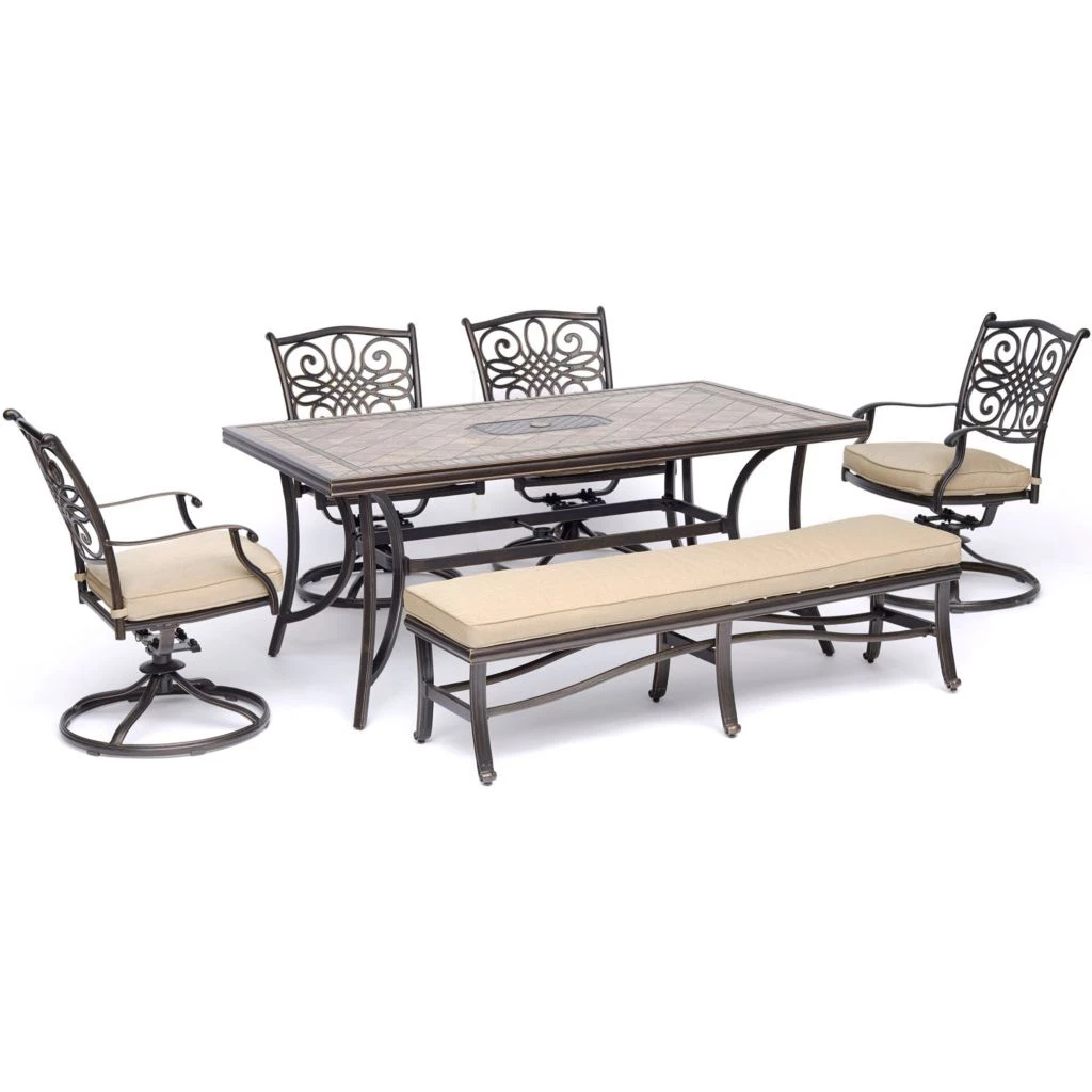 - Patio set includes 4 swivel rockers with seat cushions, one cushioned bench, and a tile-top dining table