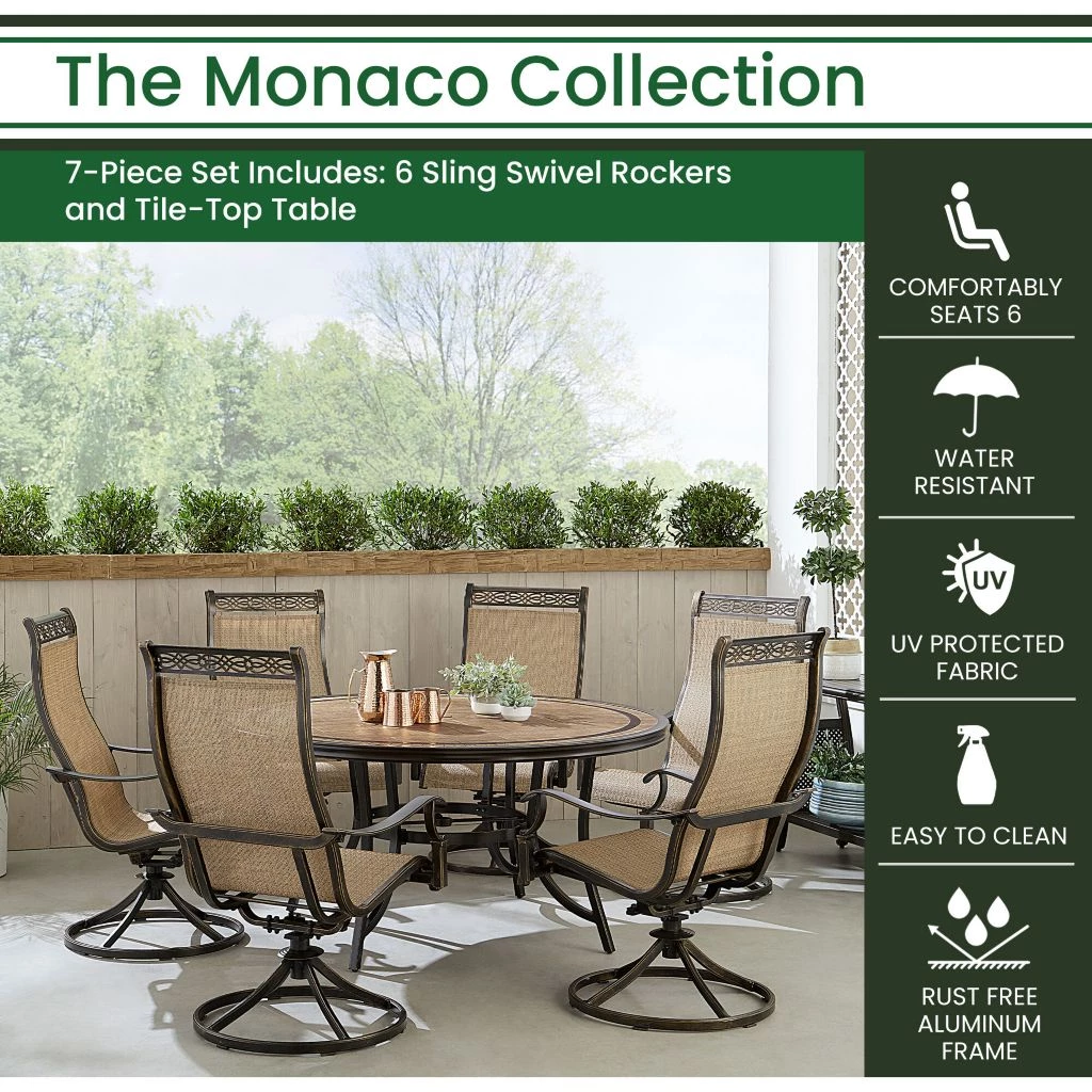 Hanover Monaco 7 pc. Outdoor Dining Set with 6 Sling Swivel Rockers and a 60 in. Tile-Top Table, MONDN7PCSW6RDTL