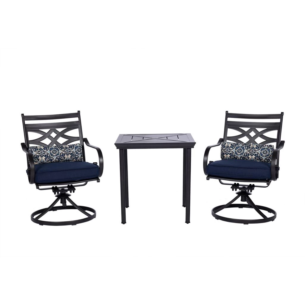 Hanover Montclair 3 pc. Bistro Dining Set in Navy Blue with 2 Swivel Rockers and a 27 in. Square Table, MCLRDN3PCSW2-NVY