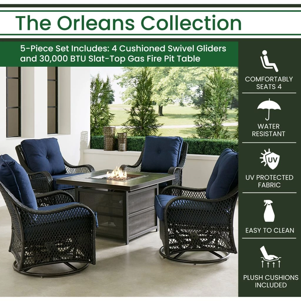 Hanover Orleans 5 pc. Deep Seating Set with 4 Cushioned Gliders, Navy, 38 in. 30000 BTU Gas Fire Pit Table, ORL5PCSLSW4FP-NVY