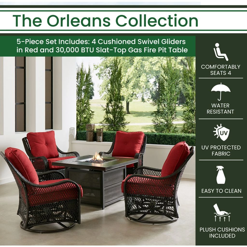 Hanover Orleans 5 pc. Deep Seating Set with 4 Cushioned Swivel Gliders, 38 in. 30,000 BTU Gas Fire Pit Table, ORL5PCSLSW4FP-BRY