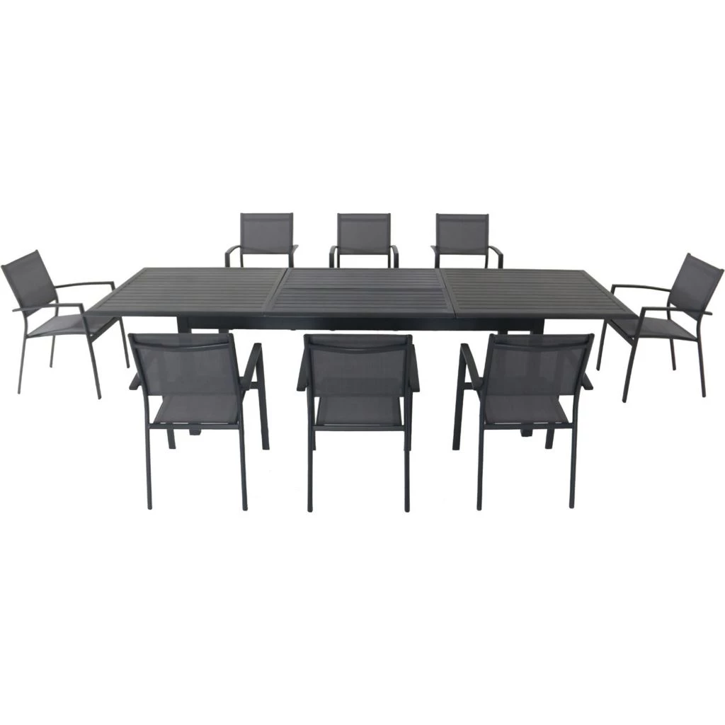 - Set includes an expandable dining table and 8 sling dining chairs