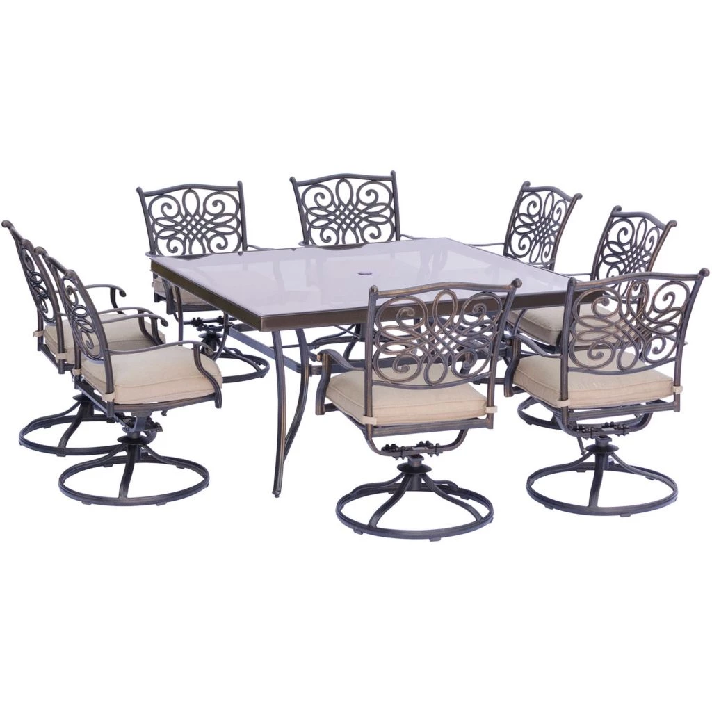 - Patio set includes eight swivel dining chairs, eight seat cushions and a square, glass-top dining table
