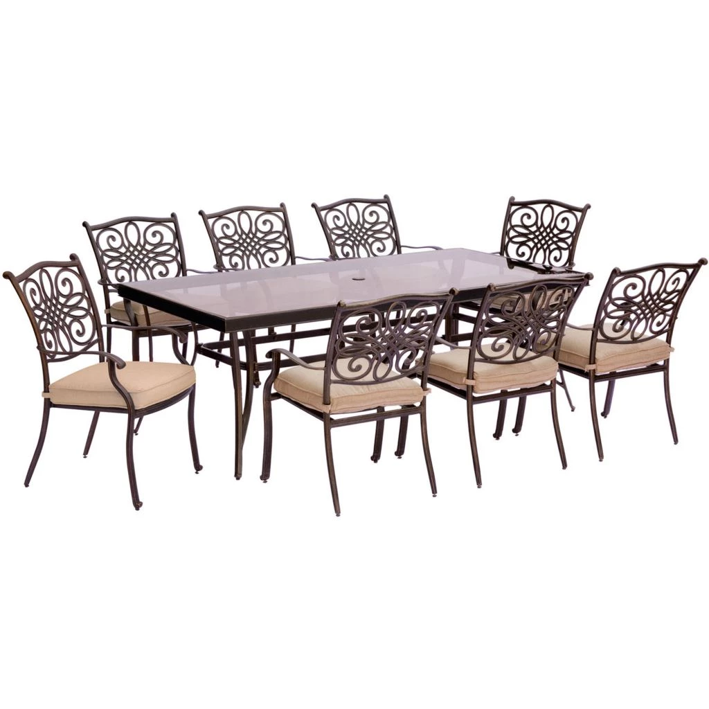New! Hanover Traditions 9 pc. Dining Set with Extra-Long Glass-Top Dining Table, Tan, TRADDN9PCG