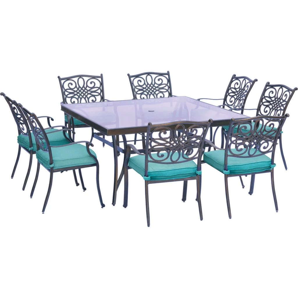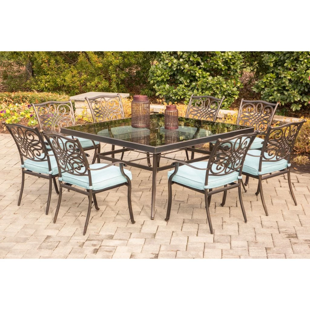 - Dining set includes eight stationary dining chairs, eight seat cushions and a large square glass-top dining table
