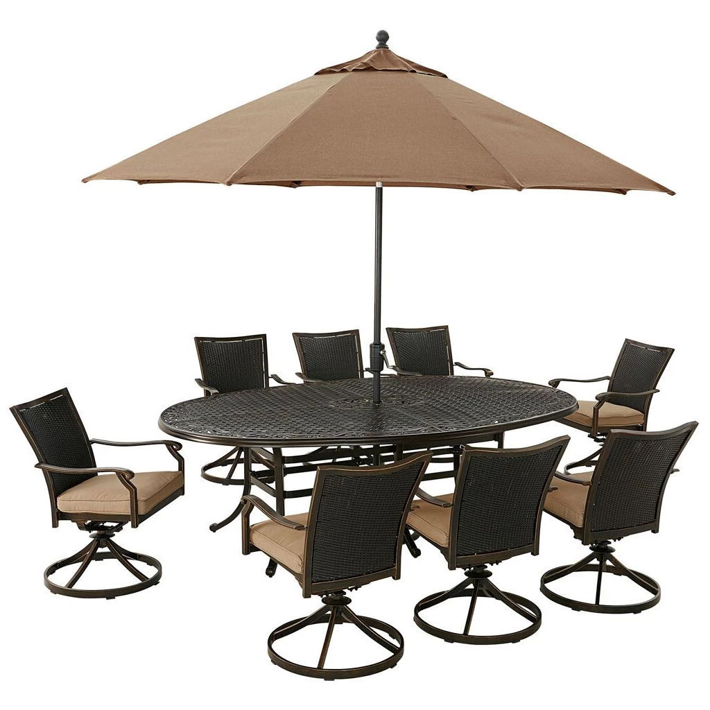 New! Hanover Traditions 9 pc. Patio Furniture Set with 8 Rockers and 95 in. x 60 in. Dining Table, Tan, TRADDNWB9PCOVSW8-TAN